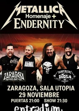 Ven a disfrutar del homenaje a Metallica realizado por la banda de temas propios Endernity, que además hará su show completo. Nuestro objetivo es defender la música original y que nos conozcas y hacerte un regalo de más de 90 minutos de lo mejor de Metallica para que sea una fiesta en toda regla. Estamos deseando visitar Zaragoza porque será nuestra primera vez allí. Hemos rodado con este show por toda España y nos falta una ciudad tan emblemática como la tuya.