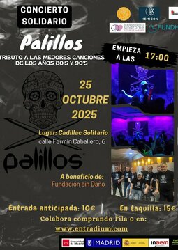La Asociación Conciertos Solidarios organiza un concierto solidario de música de los 80 y 90 ofrecido por el grupo PALILLOS MUSIC el viernes 25 de octubre DE 2025 a las 17:00 horas en la Sala Cadillac Solitario (Calle Fermín Caballero 6, 28034 Madrid) a favor de la FUNDACION DE HEMISFERECTOMIA, LA FUNDACION SIN DAÑO, LA ASOCIACION SINDROME DE STURGE WEBER todas entidades sin ánimo de lucro, y su finalidad es informar y asesorar a los familiares de personas que padezcan epilepsia o daño cerebral, proporcionar espacios de apoyo entre familias y sistemas de ayuda, así como asesoramiento, información y acciones de sensibilización sobre los problemas y necesidades que presenta este colectivo..