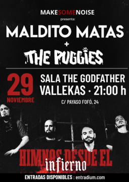 El próximo sábado 29 de noviembre celebraremos una noche de punk-rock en la Godfather de Vallekas, de la mano de Maldito Matas, presentando su nuevo trabajo "Himnos desde el Infierno", junto a la bandas madrileña The Puggies, que nos dará buena muestra, con su potente directo, de lo mejor de su repertorio.