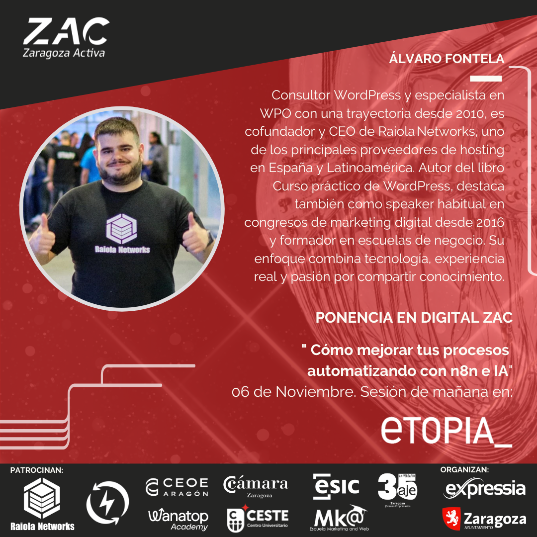 - "Automatizando con n8n e IA”, a cargo de Álvaro Fontela, CEO y cofundador de Raiola Networks.