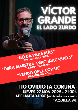 "El lado zurdo es el nuevo espectáculo de humor de Víctor Grande, cómico con 25 años de experiencia, finalista de Tú si que vales (Telecinco) y guionista de algunos de los programas de más éxito de TVG (Quen anda aí, Malicia Noticias).