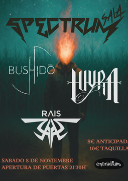 Sábado 8 de noviembre de 2025 podréis disfrutar de las actuaciones de: RAIS (metal alternativo), LUVRA (rock/metal alternativo) y BUSHIDO (rock alternativo). La apertura de puertas será a las 21:30. Os esperamos.