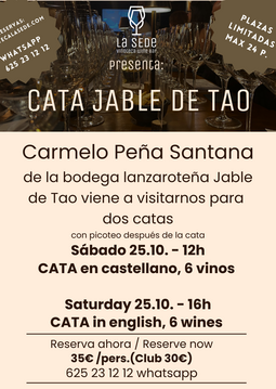 Vuelven las Catas a La SEDe. Estamos muy emocionadas abrir el circulo de eventos de la temporada 2025/2026 con una bodega de Lanzarote: Nos visita Carmelo Peña Santana, galadornado por Tim Atkin mejor Enologo joven 2025 de las Islas Canarias, y nos presenta su proyecto Jable de Tao.
