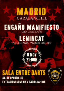 Noche de Punk-Rock y Streetpunk de la mano de Engaño Manifiesto (Toledo) y Lenincat (Santiago de Compostela). Ambos grupos se encuentran presentando sus trabajos más recientes a lo largo de toda la península y hacen paso por Madrid en la mítica sala Entre Darts Rock para una noche inolvidable.