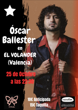 Óscar Ballester, músico alicantino, viene a presentar sus canciones y gira "Cuentas Pendientes" a la capital del Turia. Después de pasar por las ciudades más importantes del territorio en este 2025, Ballester presentará sus canciones de toda su trayectoria. Producido y grabado por Borja Montenegro, guitarrista de Joaquín Sabina, Luz Casal… llevará sus temas en formato acústico. No dudéis ni un segundo!