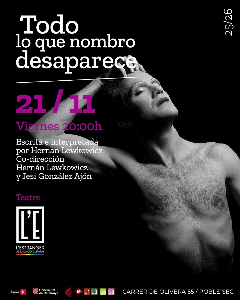 “Todo lo que nombro desaparece”, una suerte de melodrama queer, es ante todo una voz que narra: La Deseo, transformista, deriva -o naufraga- entre géneros. Es hombre y es mujer, no es una ni otra, inventa su propia biografía: trama un relato que dice pero oculta, vuelve sobre sí, maquilla, mejora, miente. El pasado se vuelve presente y el presente está infectado por los recuerdos. Con una escenografía mínima y un único vestuario que va cambiando y resignificándose en el uso, la obra arma el truco de magia y lo revela. El personaje, frente al público, cambia la piel.