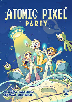 Consigue el merchandising oficial limitado de la Atomic Pixel Party Expedición Espacial con el arte del ilustrador Nil López. Posters, llaveros y mucho más con el diseño del cartel de la fiesta. ¡Una vez agotados no se volverán a hacer!