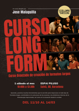 En este intensivo avanzado de creación de un formato largo improvisado profundizaremos en estructuras y recursos para mantener viva y vibrante una historia improvisada de duración aproximada de una hora, usando la técnica de la SLOW IMPRO, lo que nos garantiza verdad escénica y conexión. Buscaremos cómo dar sentido y coherencia a la historia, aprenderemos las estructuras que nos ayudan a mantenernos presente a la vez que tenemos una visión general, y reforzaremos la unión del grupo para llegar a fluir y a disfrutar de la implicación y la magia de la creación colectiva. Haremos una representación delante de público en sala del resultado final.