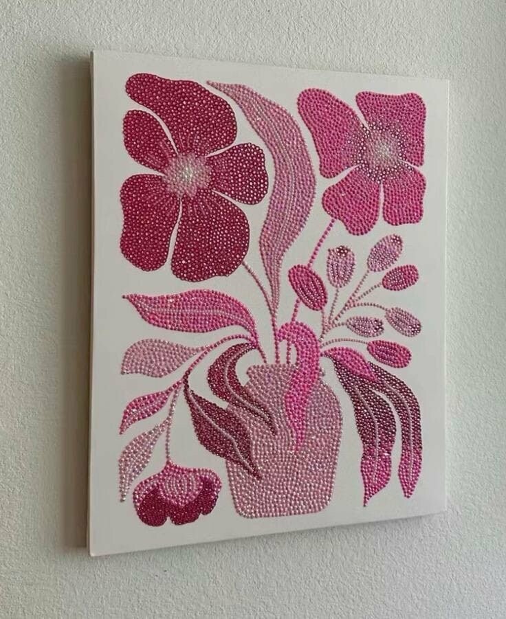 Vamos a decorar un lienzo con rhinestones en tonalidades rosas/rojas, paso a paso, a tu ritmo y con tu estilo. Puedes seguir una plantilla o dejarte llevar y crear algo totalmente tuyo.