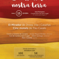 Com a concert previ al conegut Festival de Pasqua de Cervera, el Cor de Cambra Sant Cugat i la Coral La Ginesta de la ciutat de Cervera, interpretaran l’obra “El Mirador”, de Josep Vila, una fantasia coral que ens descobreix un joc entrellaçat de les cançons populars catalanes més entranyables, i un recull de cinc motets del mestre Pau Casals coneguts arreu del món, com “O vos omnes”.