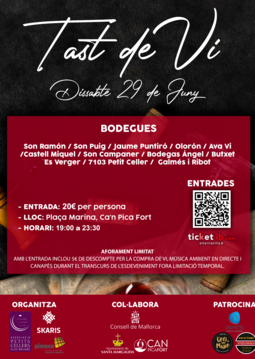 Us convidem al nostre primer tast de vi, que tindrà lloc el proper 29 de Juny a Plaça Marina, Ca'n Pica Fort. On comptarem amb un bon desplegament de cellers de l´illa i un càtering a la mallorquina i gurmet. Acompanyats de música ambient en directe i una companyia de categoria. L´entrada són 20€ per persona incloent un descompte de 5€ per la compra de vi. Vull fer una menció especial als nostres col·laboradors: Consell de Mallorca, Ajuntament de Sta Margalida i Ca´n Pica Fort. Així mateix també un especial agraïment als nostres patrocinadors: Grupotel, Galletes Gori i Supermercats Ca'n Toni.
