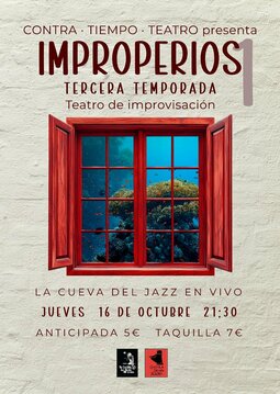 Jueves 16 de octubre de 2025. IMPROPERIOS 1 - Tercera temporada. Teatro de improvisación a cargo de la compañía Contra Tiempo Teatro. Hora: 21:30. Lugar: Interior de La Cueva del Jazz en Vivo (C/Puerta Nueva 30 Bajo - Zamora). Entrada anticipada: 5 €. Entrada taquilla: 7 €. Entradas a la venta en La Cueva del Jazz en Vivo y en Entradium.