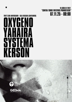 Para celebrar este aniversario tan especial, hacemos akelarre en la Sala Niágara con cuatro artistas para seguir escribiendo nuestra historia: Oxygeno, Yahaira, Systema y Kersön. Juntos daremos forma a una noche que resume lo que somos: energía, música y familia en la pista.