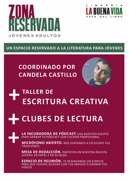 - al Taller de Escritura (para jóvenes de 13 a 18 años) que dirigirá mensualmente Candela Castillo, la librera más joven de La Buena Vida, doble grado en Periodismo y Humanidades, máster en Análisis Sociocultural del Conocimiento y de la Comunicación y actualmente cursando el Doctorado en Sociología y Antropología de la Universidad Complutense de Madrid. Candela es la coordinadora de nuestra Zana Reservada.
